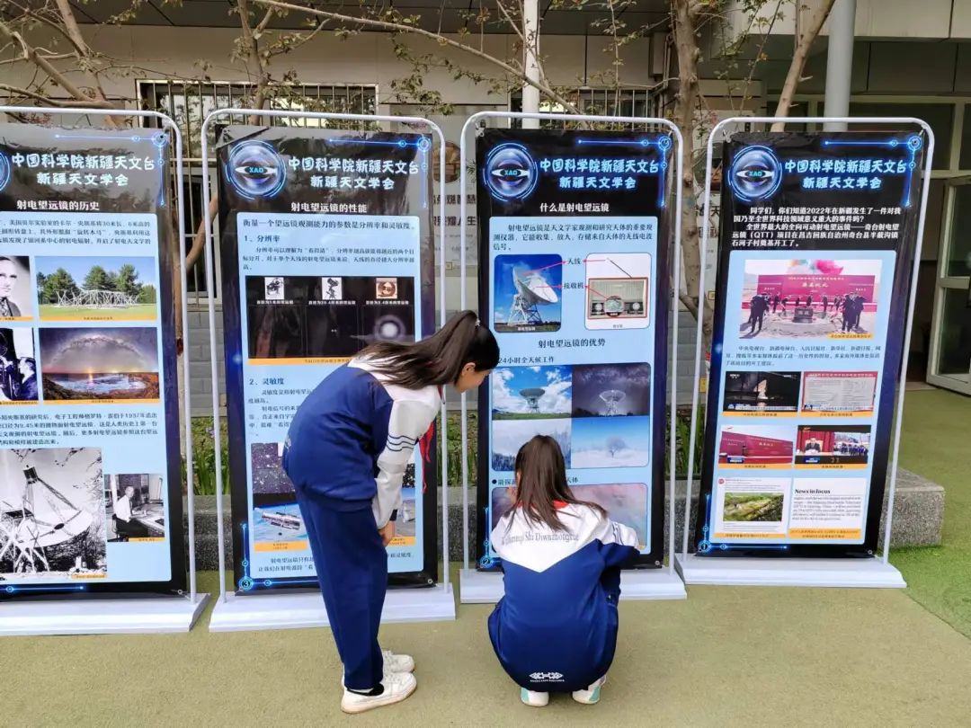 本次活动,首先,利用中国科学院新疆天文台新疆天文学会提供的精品展板,师生自行参观、学习,了解射电望远镜的含义、性能、发展历史、工作原理以及取得的成就,让学生在探索新知的过程中激发出对天文学的兴趣。
