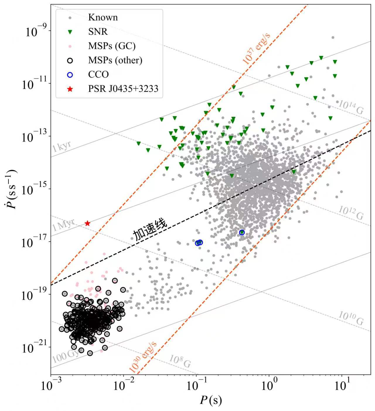 PSR J0435+3233在周期—周期变化率图中的位置。新疆天文台供图