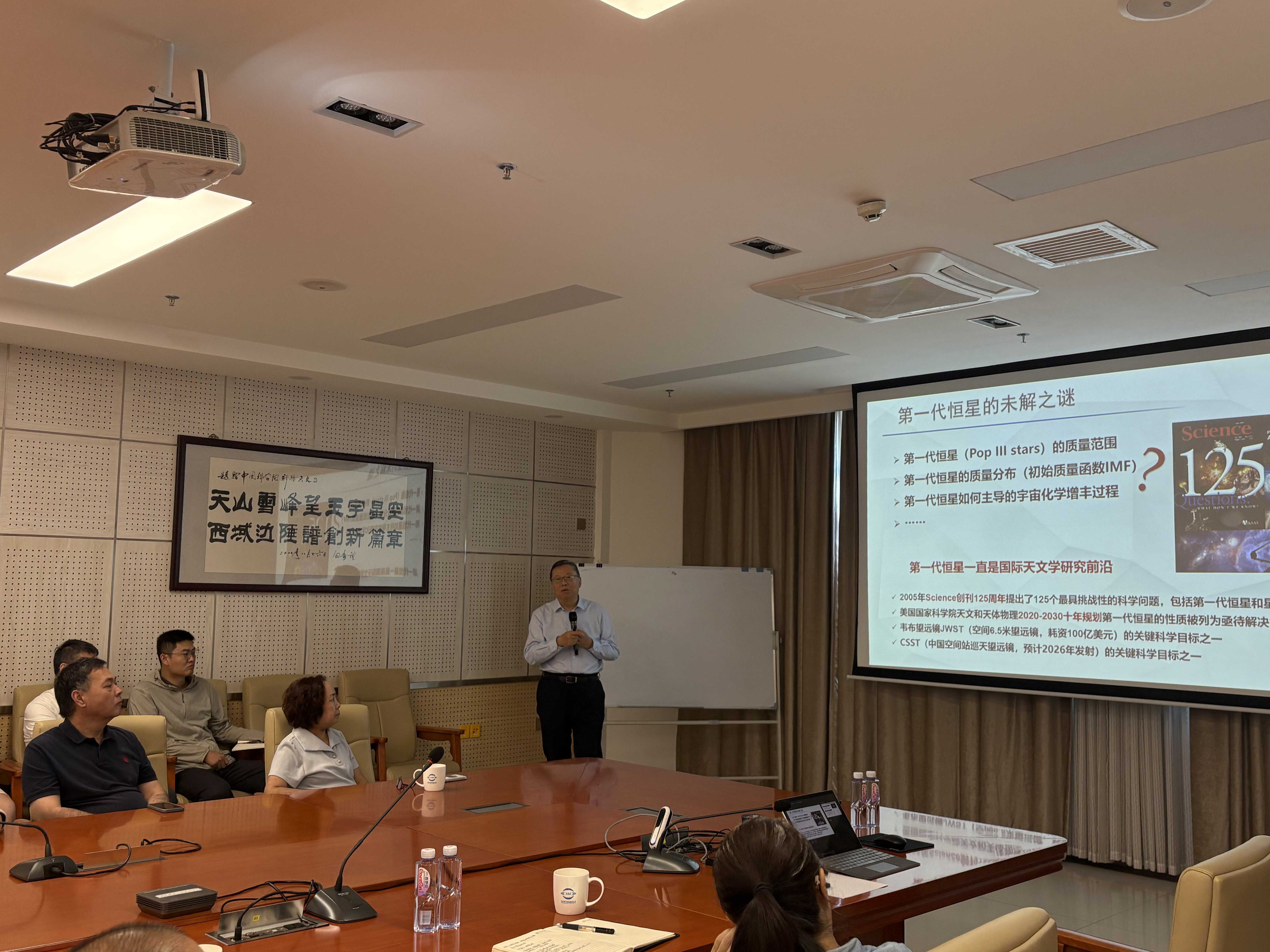 9月11日,赵刚院士在新疆天文台作了题为《第一代超大质量恒星的化学印记》的精彩学术报告。报告中,赵刚院士介绍了研究团队通过 LAMOST光谱巡天数据发现的一颗位于银河系晕的化学丰度特殊的低 alpha 恒星,并通过高分辨率光谱观测,发现这颗恒星的化学元素丰度模式与对不稳定超新星的理论模型一致,详细的分析表明形成该恒星的物质主要来自于一颗 260倍太阳质量的第一代超大质量恒星,这一发现证实了第一代恒星的质量可以达到数百倍太阳质量,以及不稳定超新星在宇宙早期化学增丰过程中的贡献。报告现场气氛热烈,与会科研人员与研究生就相关科学问题与赵刚院士进行了踊跃的交流和讨论。