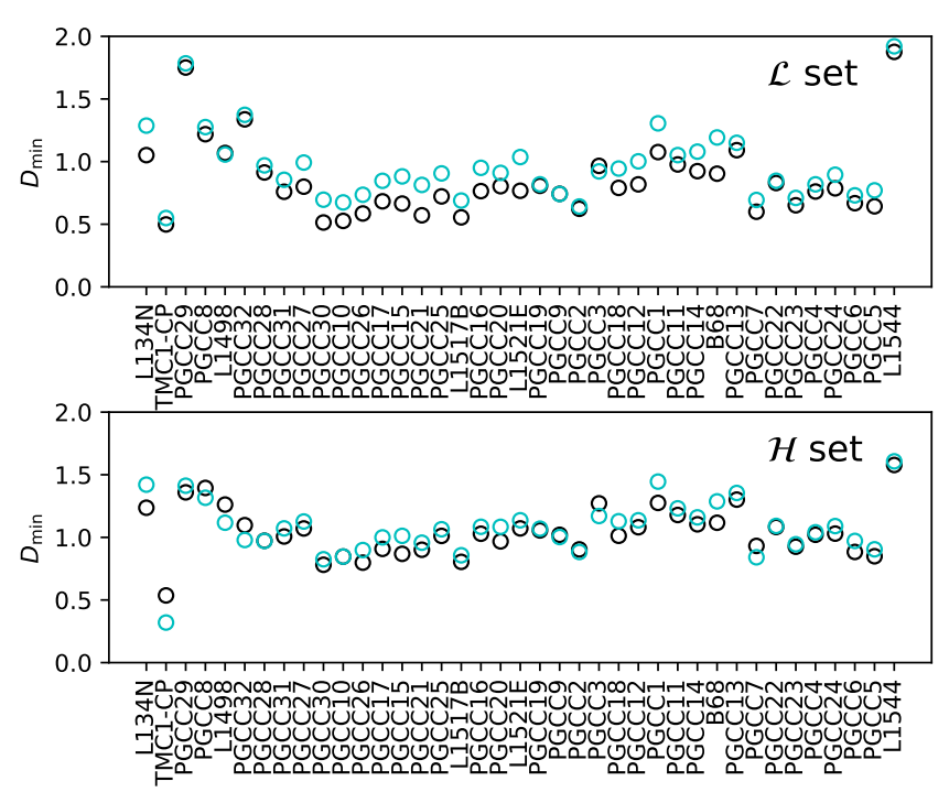 图1:观测样本与模型的符合度对比。黑色--不含PAHs;青色--包含PAHs。上下分别对应模型初始丰度:低(L)和高(H)金属丰度。