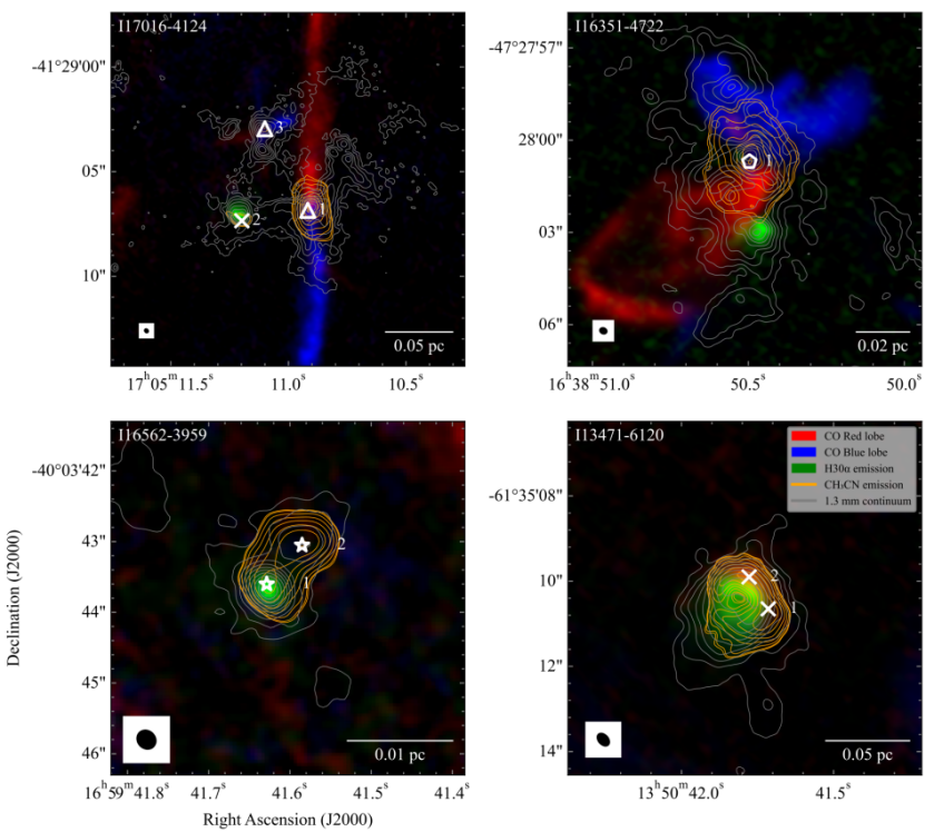 近日,中国科学院新疆天文台博士生孟德朝在合作导师刘铁研究员和导师加尔肯·叶生别克研究员的指导下,利用ALMA-QUARKS巡天数据系统性研究一批原恒星团,发现大质量热核(hot core)可以出现在大质量原恒星演化的各个阶段,并对关于热核作为一个短暂演化阶段的论断提出新的挑战。研究论文已发表于国际著名天文学期刊《天体物理学报》(2026, ApJ, 997, 340)。