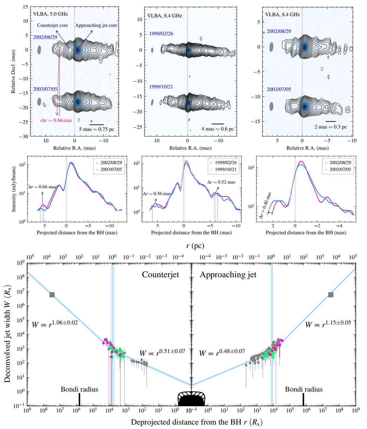 ),过渡位置在大约1 pc处。运动和准直研究结果共同表明一个(亚)秒差距尺度的喷流加速准直区,远小于中心黑洞的邦迪半径(Yan et al., 2025b, ApJ)。
