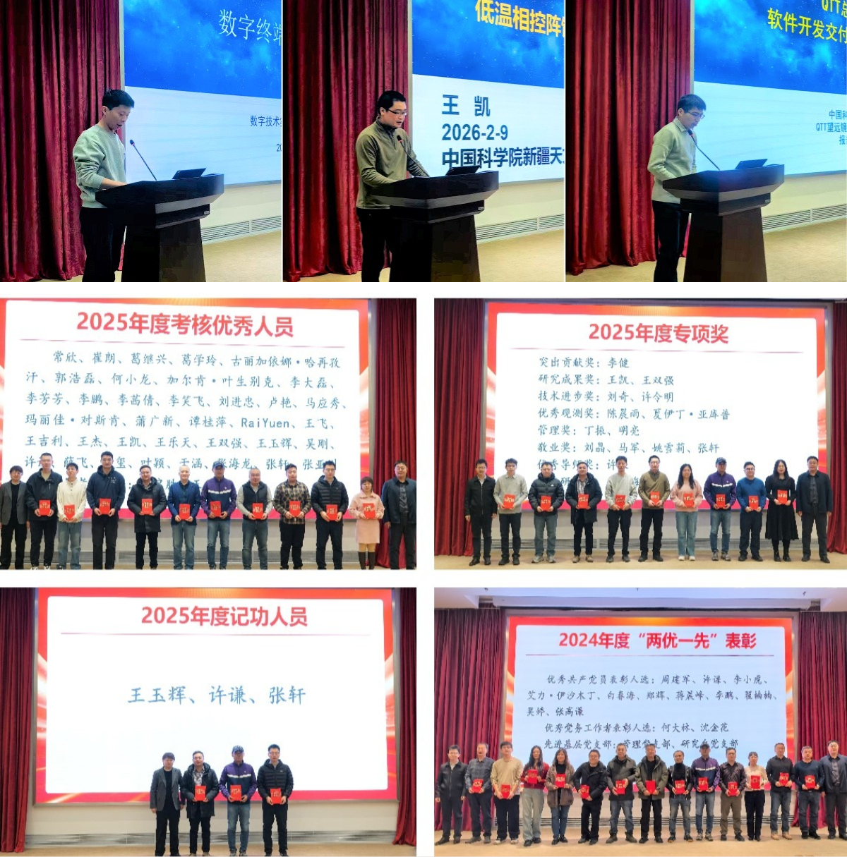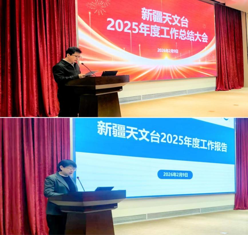 2月9日,新疆天文台2025年度工作总结大会在台本部九楼会议室举行,韩伟副台长主持会议,全台职工参加会议。新疆天文台台长周霞代表领导班子作《新疆天文台2025年度工作报告》,系统总结了过去一年全台各方面取得的成果,并结合院工作会议精神对2026年重点工作作出科学部署。她强调,2026年是“十五五”规划开局起步之年,新疆天文台将继续坚持以习近平新时代中国特色社会主义思想为指引,认真学习贯彻院工作会议精神,以钉钉子精神狠抓落实,力争产出更多具有影响力的科研成果,以实际行动和创新成果来践行天文领域国家战略科技力量的使命职责,加快抢占科技制高点,为实现“四个率先”和“两加快一努力”目标要求、实现高水平科技自立自强、建设科技强国作出更大贡献。
